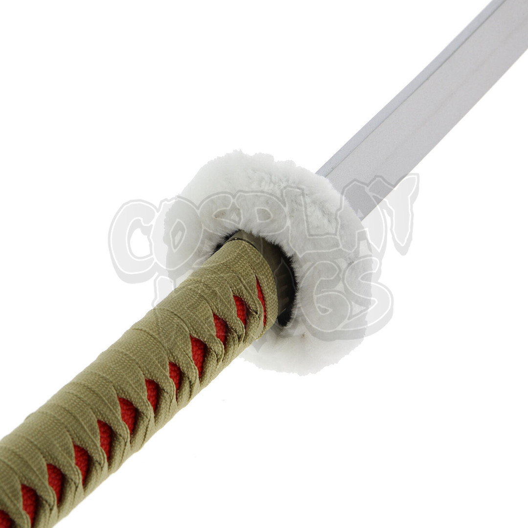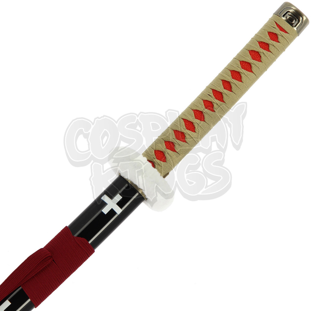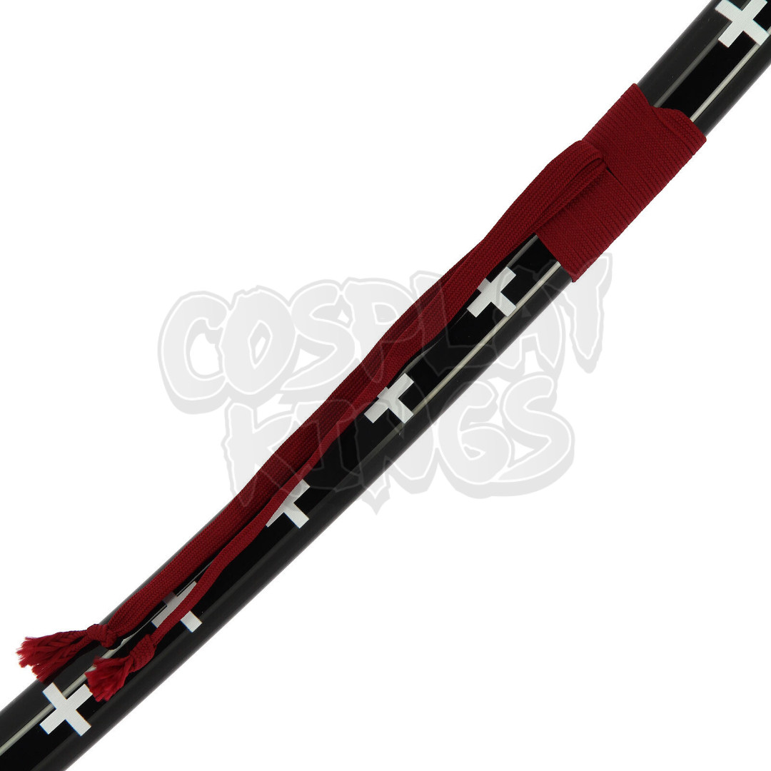 This katana features a sleek and captivating design, with striking cross motifs along the blade that create a modern and bold visual impact. The hilt is wrapped in a finely woven cord, providing both style and functionality for a secure grip. At the top, a soft faux-fur collar adds an extra layer of sophistication and uniqueness. The tsuka-ito, woven in a delicate pattern, enhances the overall aesthetic, offering a balance of strength and grace.