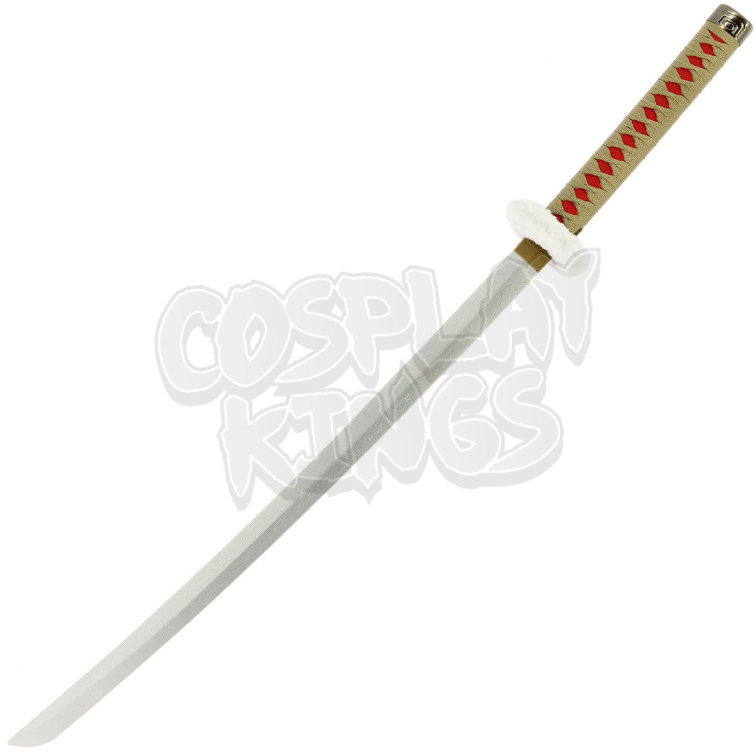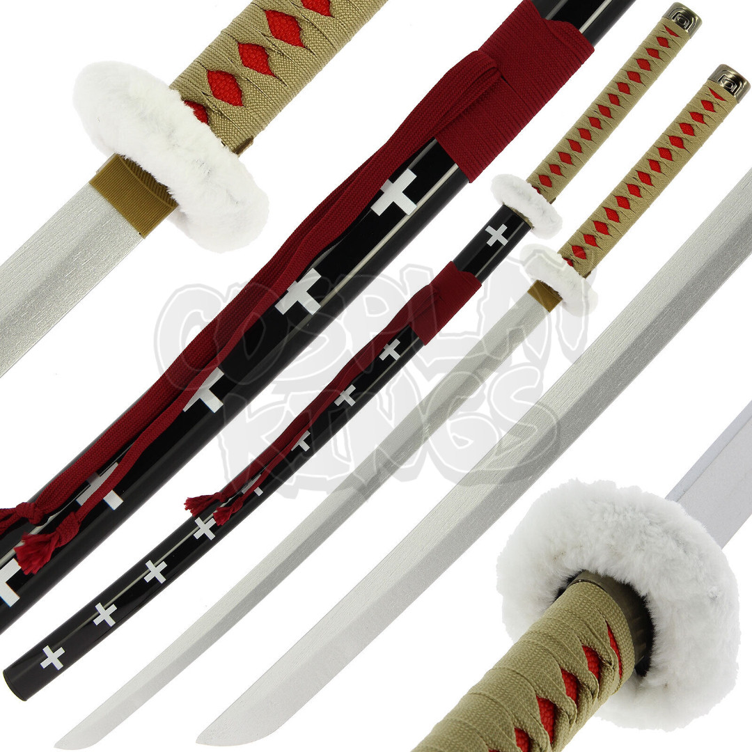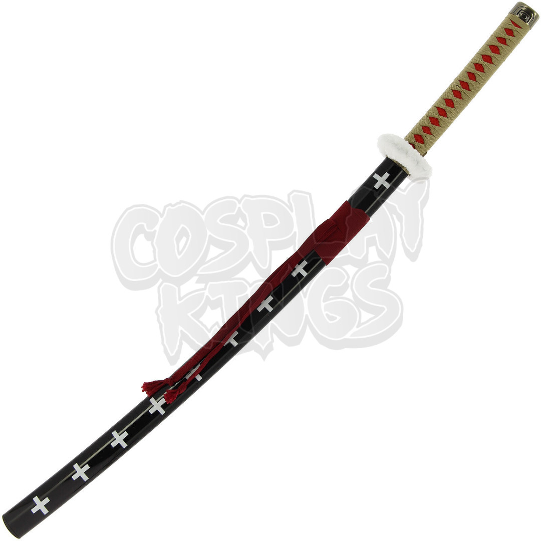 This katana features a sleek and captivating design, with striking cross motifs along the blade that create a modern and bold visual impact. The hilt is wrapped in a finely woven cord, providing both style and functionality for a secure grip. At the top, a soft faux-fur collar adds an extra layer of sophistication and uniqueness. The tsuka-ito, woven in a delicate pattern, enhances the overall aesthetic, offering a balance of strength and grace.